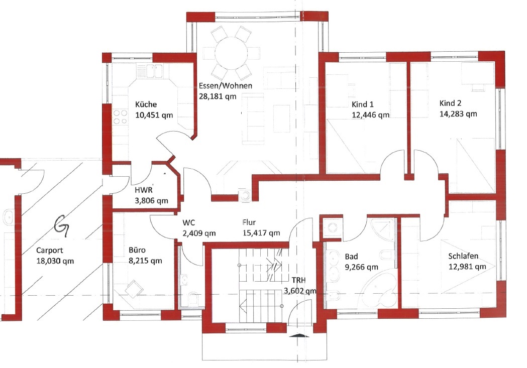 Ein zusätzliches Büro ermöglicht komfortables Arbeiten von zu Hause aus. Praktische Nebenflächen wie ein Hauswirtschaftsraum (HWR) mit direktem Zugang zum Carport, eine gemeinschaftlich nutzbare Werkstatt sowie der Waschmaschinenraum sorgen für zusätzlichen Komfort.