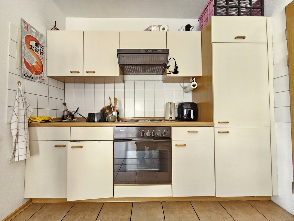 Die geflieste Küchenzeile ist funktional eingerichtet und bietet alles Nötige für den Alltag.