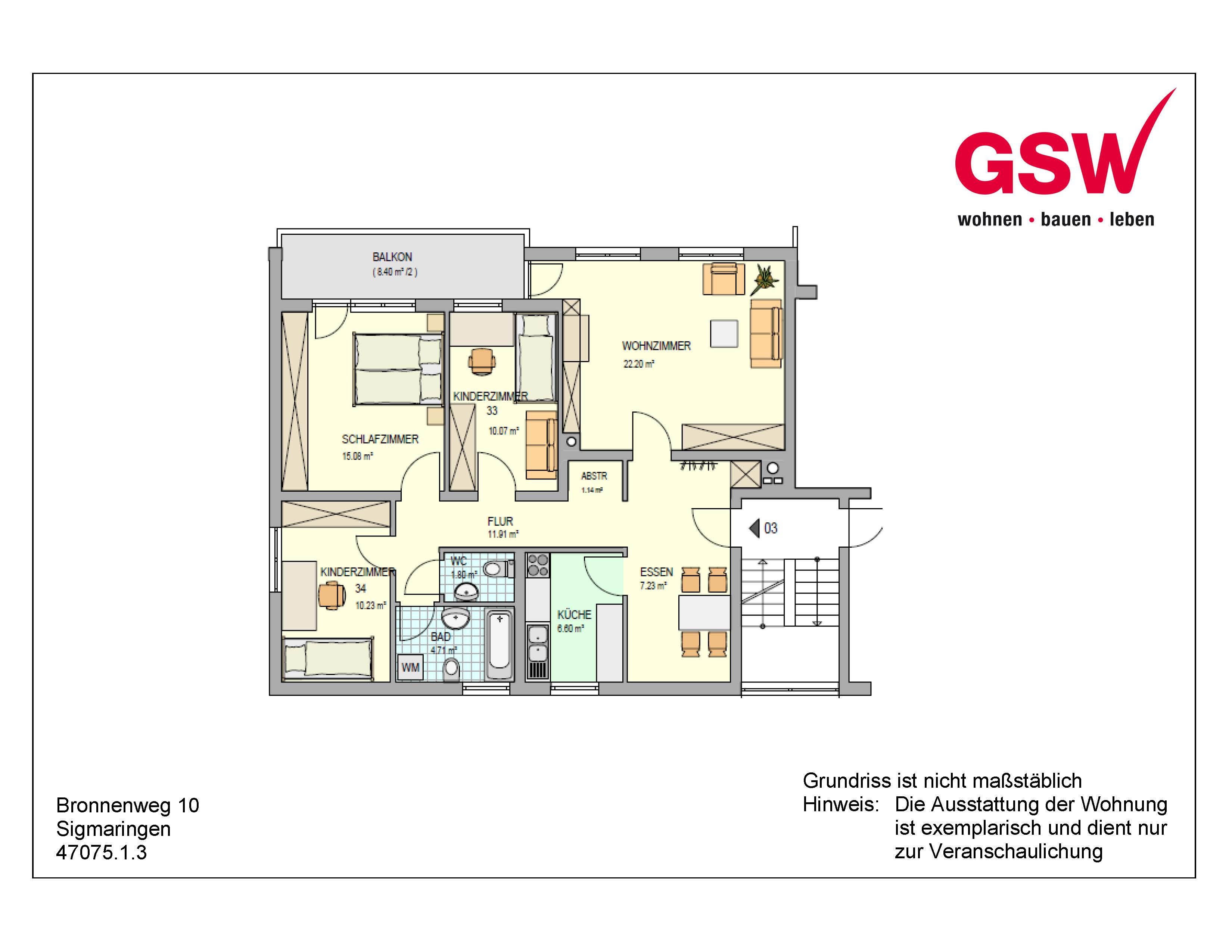 Die Küche (ohne Einbauküche) ist separat und hat einen Vorbereich der sich perfekt als Essplatz eignet. Vom hellen und großzügig geschnittenen Wohnzimmer gelangen Sie auf den Balkon der Wohnung. Die drei Schlafzimmer sind praktisch geschnitten. Ein Gäste-WC rundet das Angebot ab.